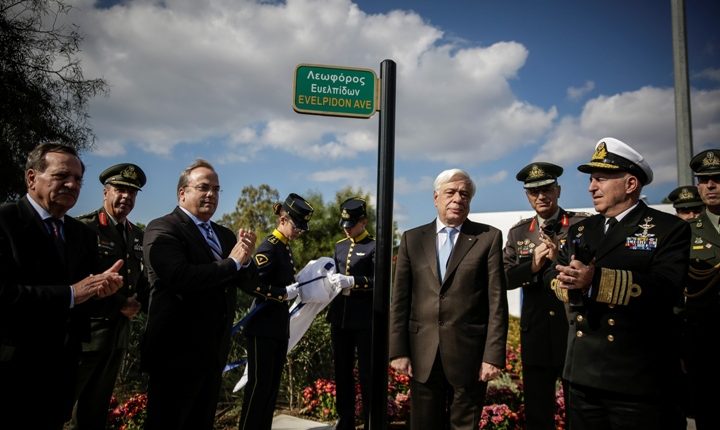 Η τελετή της μετονομασίας της Λεωφόρος Βάρης – Κορωπίου σε Λεωφόρος Ευελπίδων έγινε μπροστά από την κεντρική πύλη της Στρατιωτικής Σχολής Ευελπίδων (ΣΣΕ).