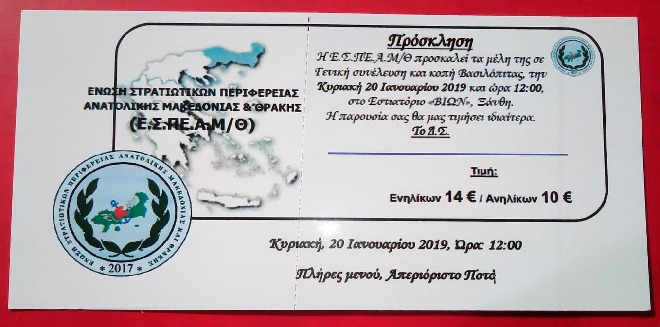 Ο Πρόεδρος και τα Μέλη του Διοικητικού Συμβουλίου, της Ένωσης Στρατιωτικών Περιφέρειας Ανατολικής Μακεδονίας και Θράκης (Ε.Σ.ΠΕ.Α.Μ/Θ), σας περιμένουμε όλες και όλους, την Κυριακή 20 Ιανουαρίου 2019 και ώρα 12:00 στο Εστιατόριο ‘’ΒΙΩΝ’’ στην δυτική είσοδο της πόλης της Ξάνθης στην κοπή της Πρωτοχρονιάτικης Βασιλόπιτας.